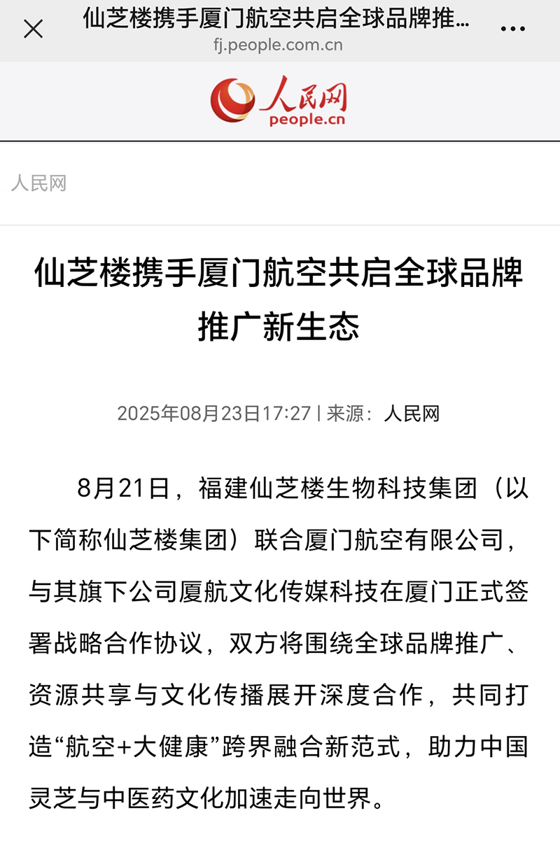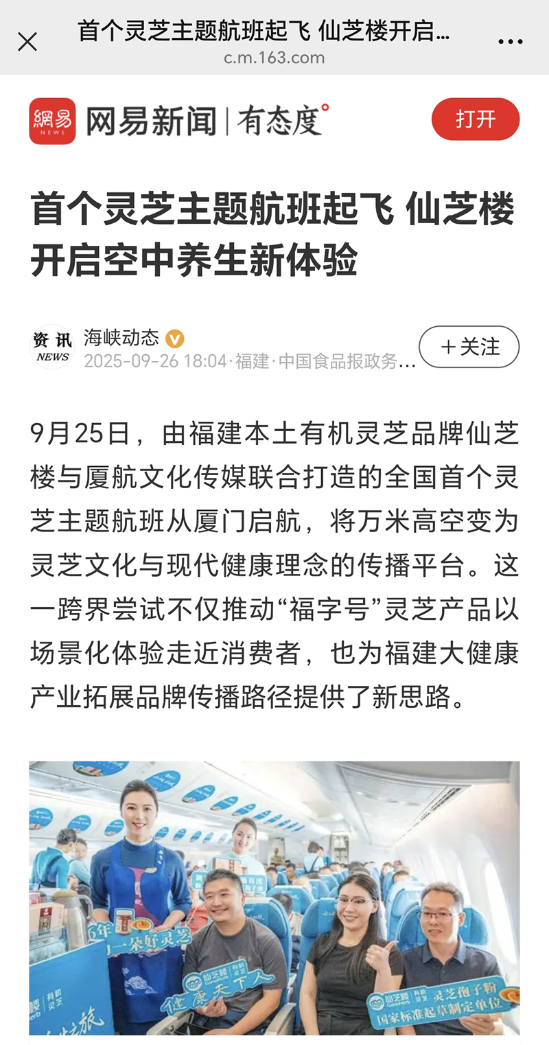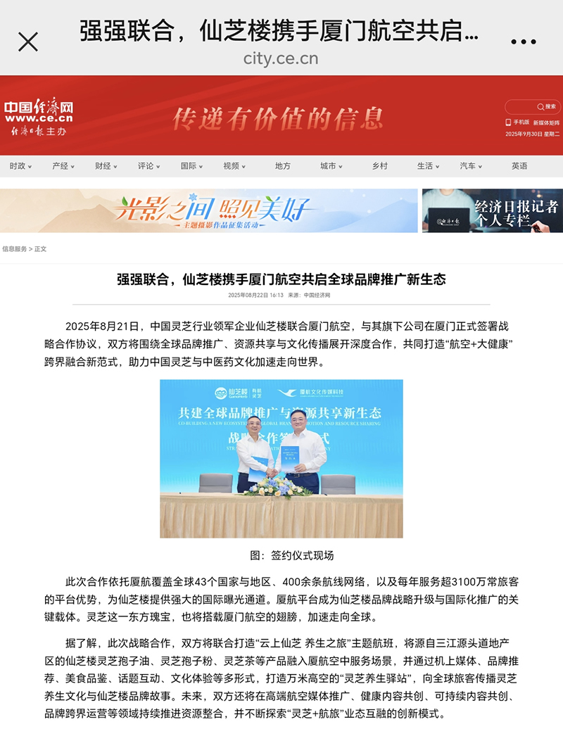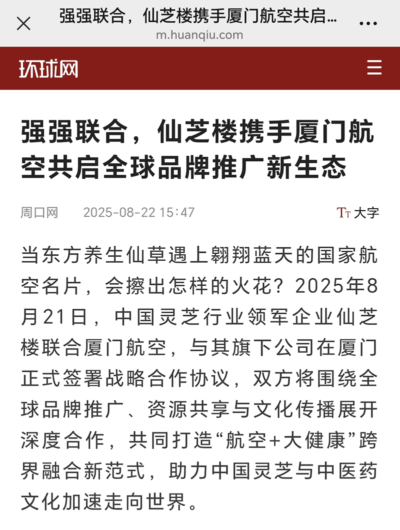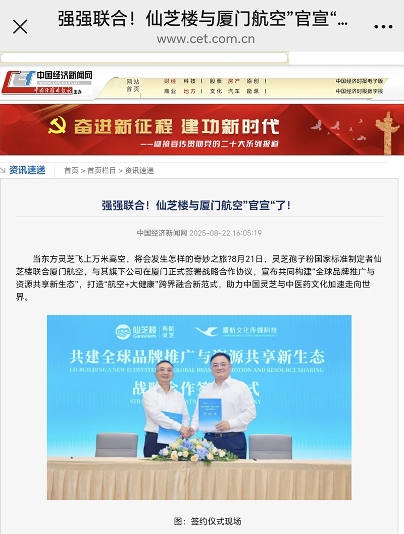 截至目前,包括新华网、人民网、人民资讯、经济日报-中国经济网、环球网、中国网、中国日报网、中国经济新闻网等十多家央媒,以及福建电视台、福州晚报、福州日报-掌上福州、闽北日报、福州新闻网、海峡消费网、新浪、百度、网易等省市级及地方媒体纷纷跟进报道,聚焦双方在高端航空媒体推广、健康内容共创、可持续内容共创、品牌跨界运营等领域持续推进资源整合,让中国灵芝与中医药文化加速走向世界。