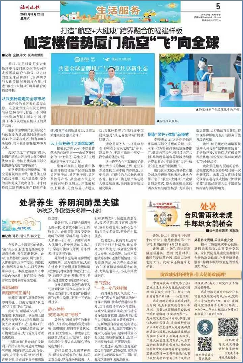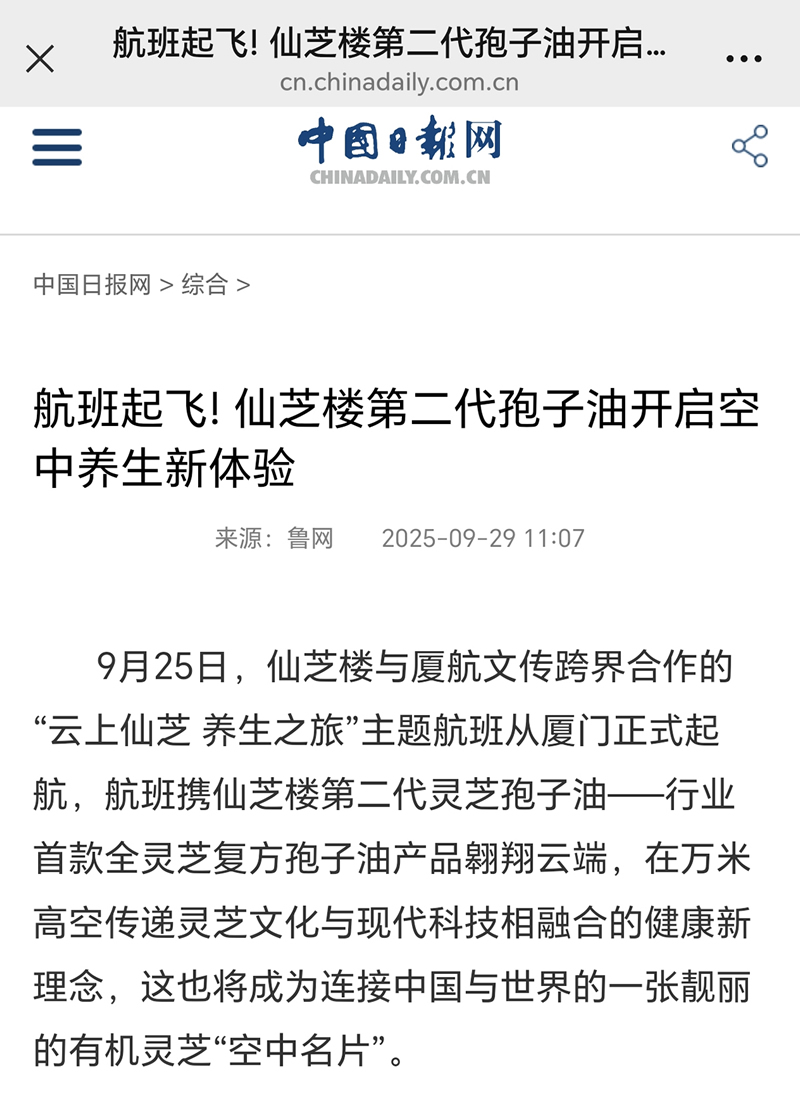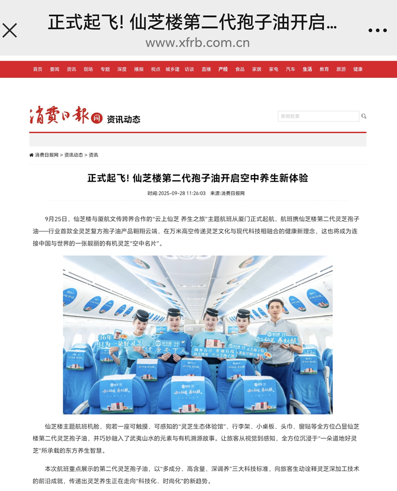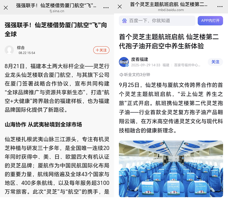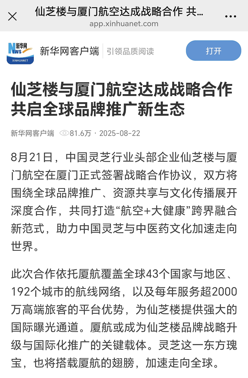 截至目前,包括新华网、人民网、人民资讯、经济日报-中国经济网、环球网、中国网、中国日报网、中国经济新闻网等十多家央媒,以及福建电视台、福州晚报、福州日报-掌上福州、闽北日报、福州新闻网、海峡消费网、新浪、百度、网易等省市级及地方媒体纷纷跟进报道,聚焦双方在高端航空媒体推广、健康内容共创、可持续内容共创、品牌跨界运营等领域持续推进资源整合,让中国灵芝与中医药文化加速走向世界。