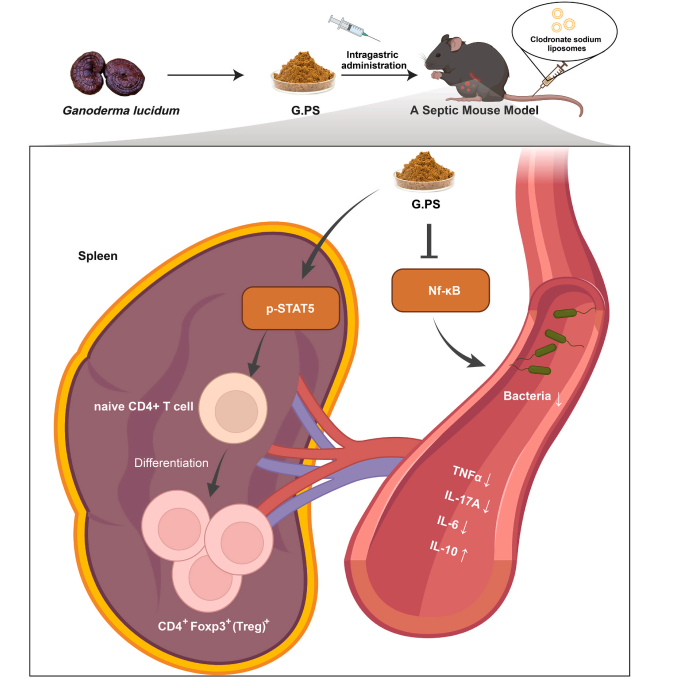 研究表明,灵芝多糖(G. PS)能显著促进CD4+ T细胞分化为CD4+Foxp3+ Treg细胞,并通过p-STAT5信号通路增强其功能(图1)。在脓毒症模型中,G. PS不仅提升Treg比例,还有效抑制炎症风暴,降低死亡率[1]。