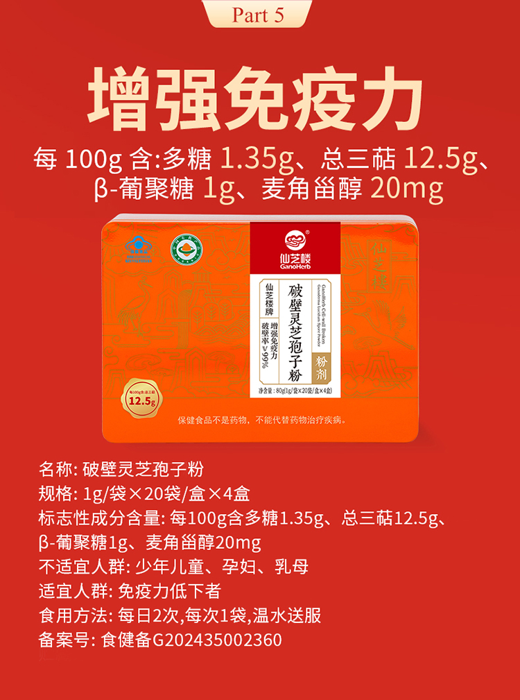 每100g含多糖1.35g、总三萜12.5g、β-葡聚糖1g、麦角甾醇20mg
